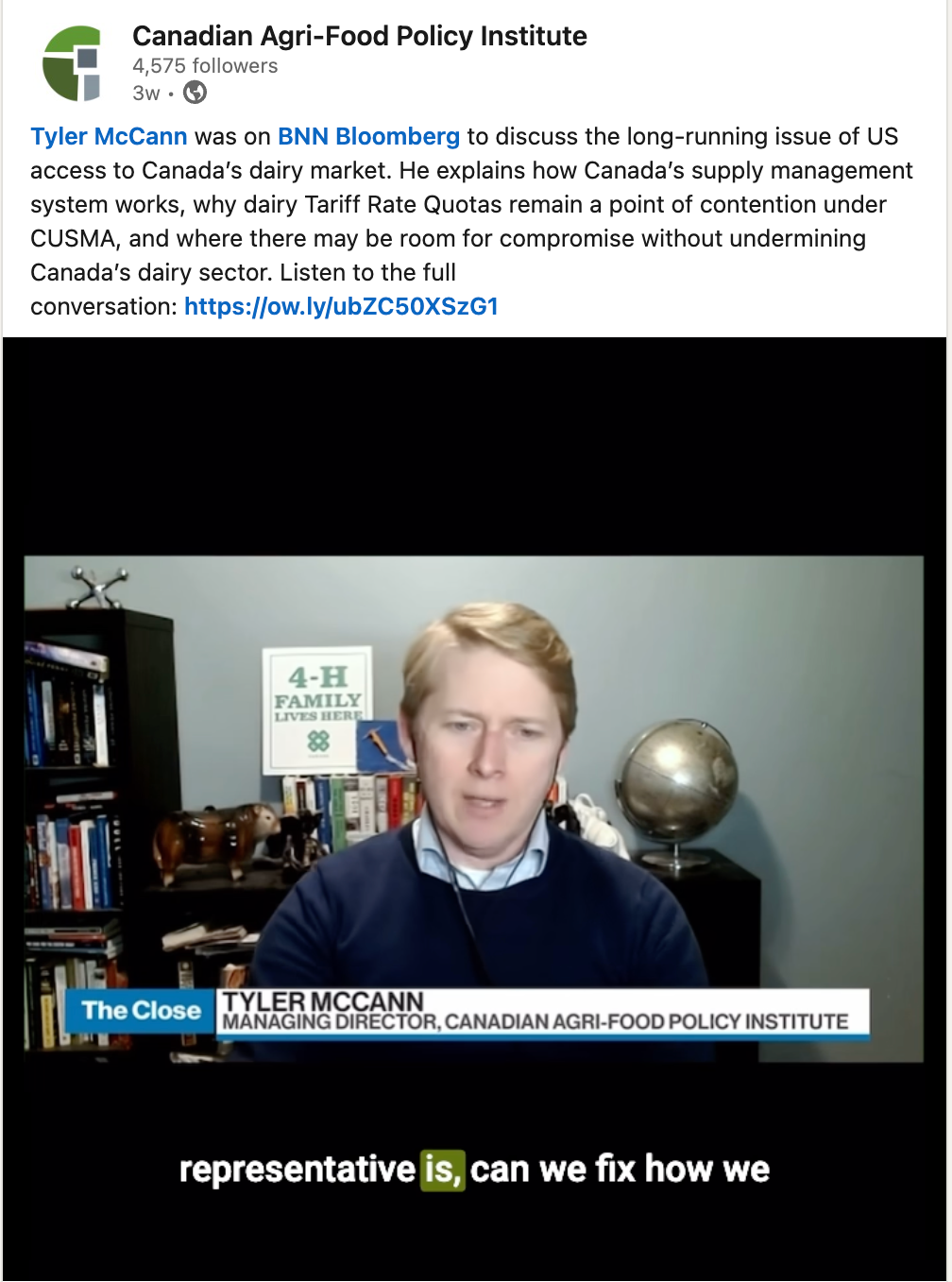 | | L'avenir de la gestion de l'offre au Canada | | Peu de sujets dans le domaine de l'agriculture canadienne suscitent autant de débats que la gestion de l'offre. À mesure que les attentes des consommateurs évoluent, que les relations commerciales internationales changent et que les pressions liées à l'accessibilité financière, à la durabilité et à la résilience s'intensifient, la gestion de l'offre est de plus en plus souvent abordée non pas comme une politique statique, mais dans le cadre d'un débat plus large sur la manière dont le Canada soutient les agriculteurs, gère les risques et assure la sécurité alimentaire. Créer un espace pour diversifier les points de vue – ceux des producteurs, des transformateurs, des décideurs politiques et des consommateurs – permet de garantir que les politiques agricoles restent réactives, transparentes et ancrées dans les réalités auxquelles le système alimentaire canadien est confronté aujourd'hui et sera confronté à l'avenir. | | | Ce sujet a également été abordé lors de la 16e Conférence annuelle sur la politique agroalimentaire canadienne, organisée par la Société canadienne d'agroéconomie à Ottawa, où Tyler McCann a présidé une session sur le système canadien de gestion de l'offre. | | |