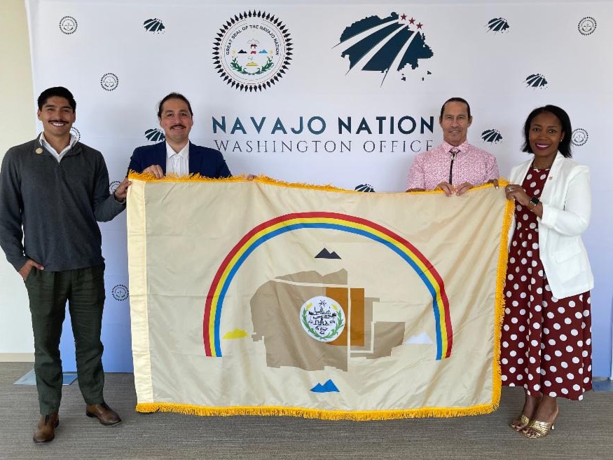 On September 15, 2025 the U.S. Forest Service (USFS) Tribal Affairs team met with the Navajo Nation Washington Office (NNWO) on Monday for a working session on land and access in the Coconino and Cibola National Forests. The visit began with a presentation of the Navajo Nation flag, which was accepted on the agency’s behalf by Dr. Beattra Wilson, Associate Deputy Chief for State, Private, and Tribal Forestry. Dr. Wilson also delivered a note from the Chief of the Forest Service to NNWO Executive Director Vince Redhouse, thanking him for hosting the meeting at NNWO, the only Tribal Nation office based in Washington, D.C. Navajo Forestry and the Navajo Nation Land Department participated, alongside USFS attendees Tribal Affairs Director Reed Robinson and Land and Minerals representatives from the USFS’s DC office, Arizona and New Mexico.