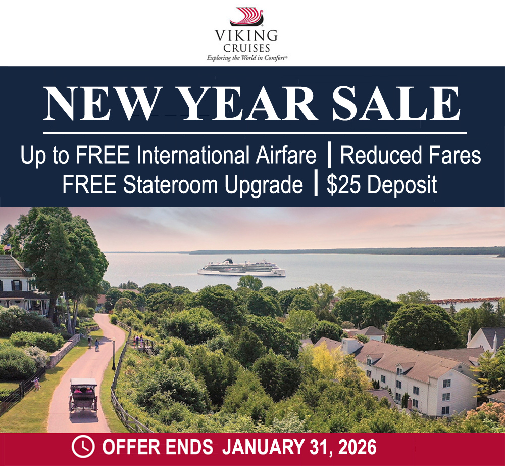 Offer valid on bookings made by January 31, 2026. FREE Airfare or reduced airfare plus FREE Stateroom upgrade (applies to categories N2 – DN1) applicable to select departures of featured itineraries during stated sailing period. Offer is based on inventory availability at time of purchase. A limited-time $25 deposit per person is due at time of booking for select departures of featured itineraries; remaining deposit is due with final payment. Pay in full by February 20, 2026, or at 120 days prior to departure (whichever comes first). Free and Reduced Air offers not valid when booked from gateways in Alaska, Hawaii, Puerto Rico, or Mexico. Reduced Air offers vary by selected Air gateway in country of residence. Airfares may vary on other gateways & departures. Air does not have to be purchased to receive cruise/cruisetour offer. Prices are based on double occupancy for CA and US residents only. Offer may be withdrawn at any time without prior notice. All fares reflect cruise taxes, port taxes and fees. Not combinable with group contract pricing. Additional restrictions may apply.
