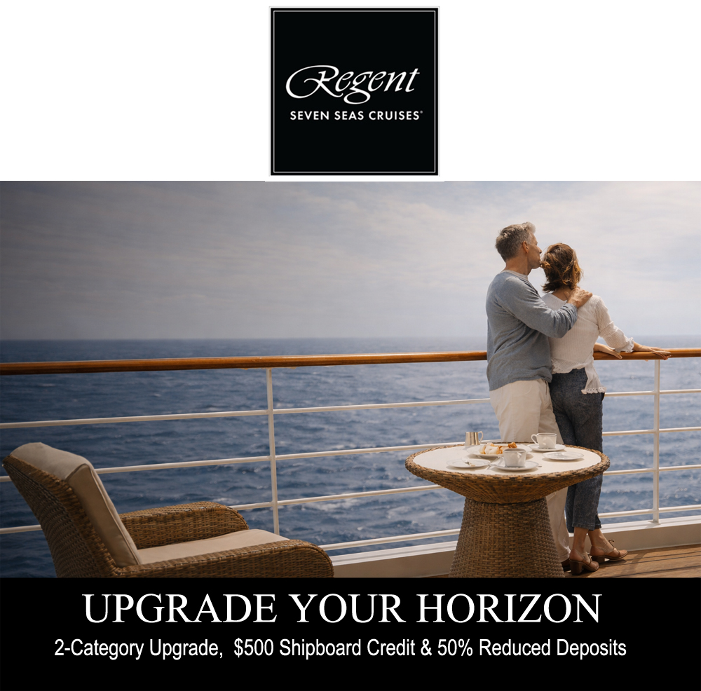 Upgrade Your Horizon offer is capacity controlled and applies to new bookings only made by February 28, 2026. Guests will receive a FREE 2-Category Suite Upgrade, up to a Penthouse Suite (Category A), on applicable voyages† as well as 50% Reduced Deposits** and a US$500 Shipboard Credit per suite on 2026 voyages***. †FREE 2-Category Suite Upgrade excludes Seven Seas Prestige™ Inaugural Sailings, Grand Voyages and World Cruises. Book and pay as follows on Seven Seas Voyager®, Seven Seas Mariner® and Seven Seas Navigator® voyages: Book a Category F Suite and pay the Category H Suite fare; book E, pay G; book D, pay F; book C, pay E; book B, pay D; or book A, pay C. Book and pay as follows on Seven Seas Grandeur®, Seven Seas Splendor® and Seven Seas Explorer®: Book a Category G1 Suite and pay the Category H Suite fare; book F2, pay G2; book F1, pay G1; book E, pay F2; book D, Suite, pay F1; book C, pay E; book B, pay D; or book A, pay C. Book and pay as follows on Seven Seas Prestige™: Book a Category F2 suite and pay the Category H fare; book F1, pay G; book E, pay F2; book D, pay F1; book C, pay E; book A, pay C. **50% Reduced Deposits are not applicable to Inaugural Sailings, Distinctive Suite Guests or voyages with 50+ nights. ***US$250 Shipboard Credit per person (up to US$500 per suite) is applicable on all 2026 voyages, excluding Seven Seas Prestige Inaugural sailings. The shipboard credit is valid only for residents of the US and Canada who either book directly with Regent Seven Seas Cruises® or through travel advisors located only in the US and Canada. Upgrade Your Horizon offer availability is limited, restrictions apply, and applicable voyages are subject to removal at any time without notice. Offer applies to select suite categories and may not be combinable with other offers and promotions. Please enquire about combinability at the time of booking. Offer may be withdrawn at any time. Offer is combinable with Onboard Savings, Seven Seas Society Savings, Regent Ambassador Savings and Active Consumer Events. Mention “HORIZON” at time of booking.