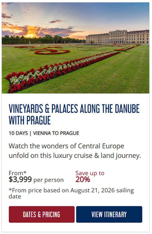 Early Booking Savings is valid for new, individual bookings on select 2026 itineraries and departure dates only. Offer applies to full-fare bookings only and is valid for any stateroom category. Availability of all stateroom categories cannot be guaranteed. All fares and savings listed are based on double occupancy. Rates and savings vary by itinerary and departure date. Savings featured are based on the cruise-tour portion of bookings only, per person, and do not apply to the purchase of air tickets or other optional vacation add-ons such as optional pre and post extensions or the Uniworld Travel Protection Plan. All applicable discounts are applied sequentially; fixed savings amounts are deducted prior to applying any percentage-based discounts. Offer is capacity controlled and may be modified or withdrawn at any time. Other restrictions may apply. Offer expires October 31, 2025.