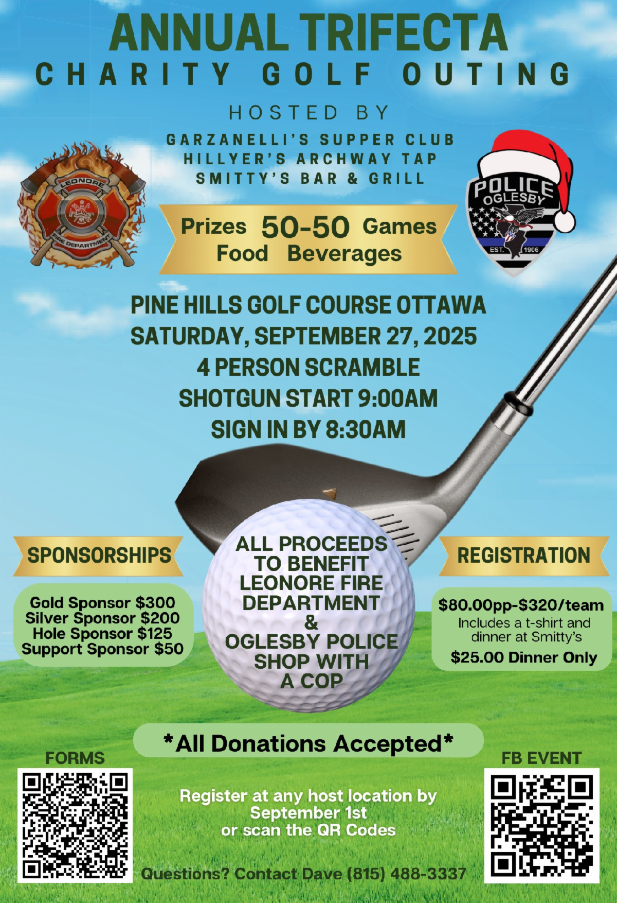 The outing will feature a four-person scramble, prizes, 50/50 drawings, games, food, and beverages. Proceeds from the event will benefit two important local causes: the Leonore Fire Department and the Oglesby Police Department’s Shop With a Cop program.