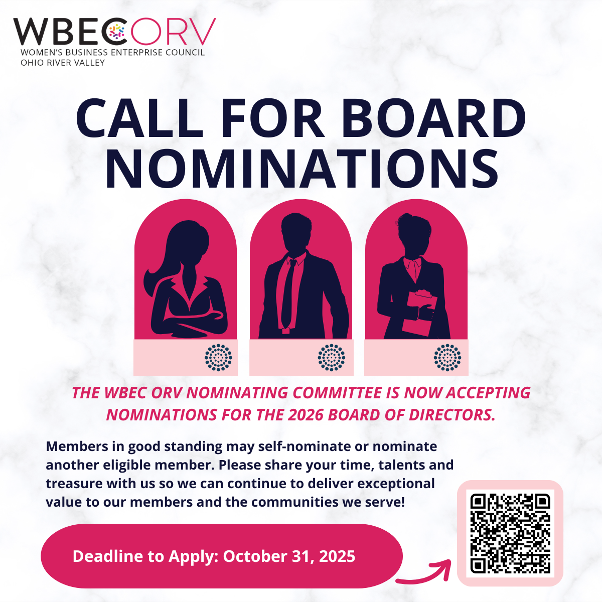 The WBEC ORV Nominating Committee is now accepting nominations for the 2026 Board of Directors. These are volunteer positions, and members are elected for 3-year terms.