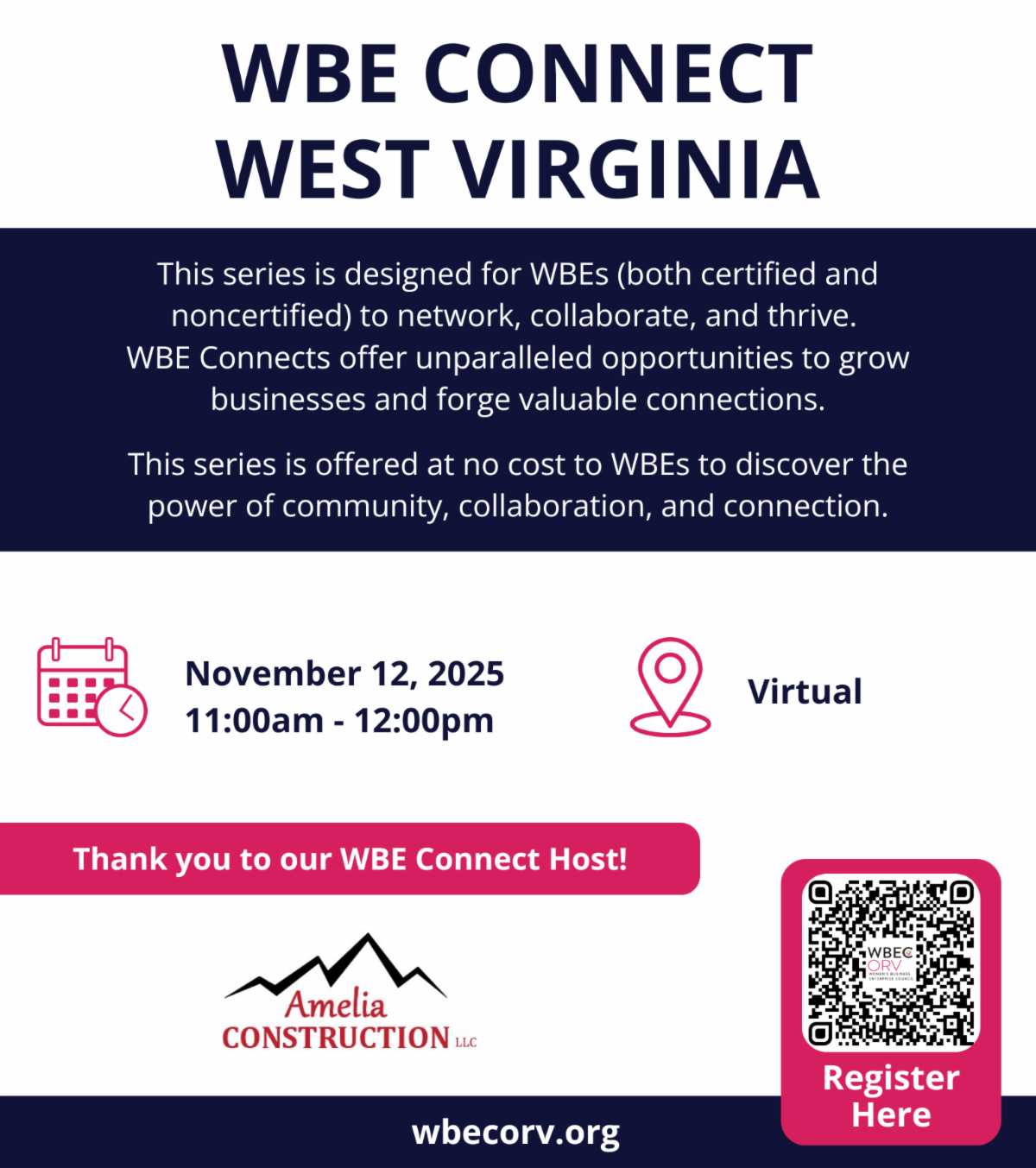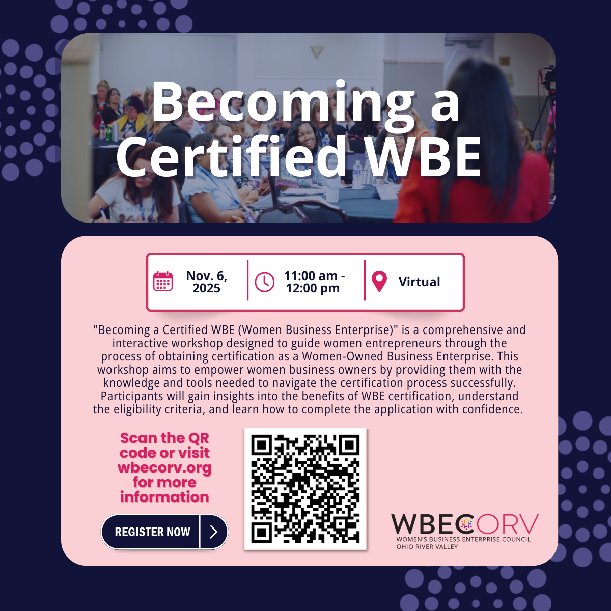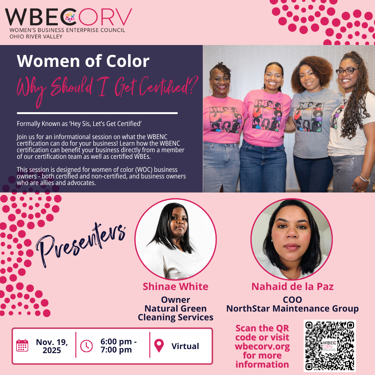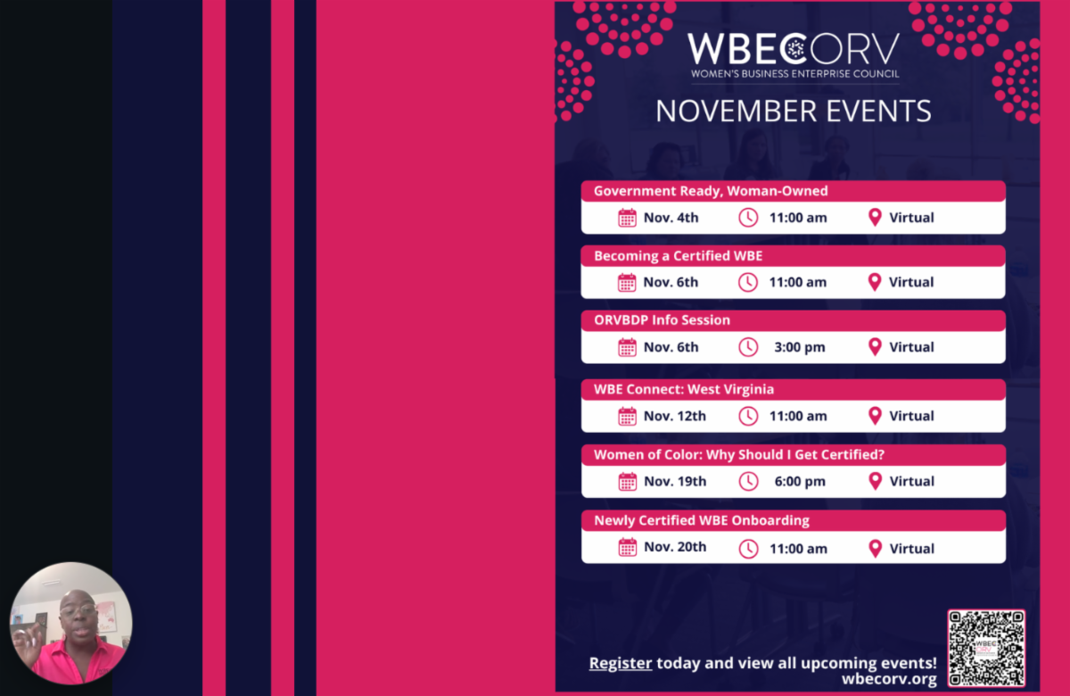 | | WBE Connect: West Virginia | Nov. 12, 2025 | 11:00am-12:00pm | Virtual | | Women of Color: Why Should I Get Certified? | |
