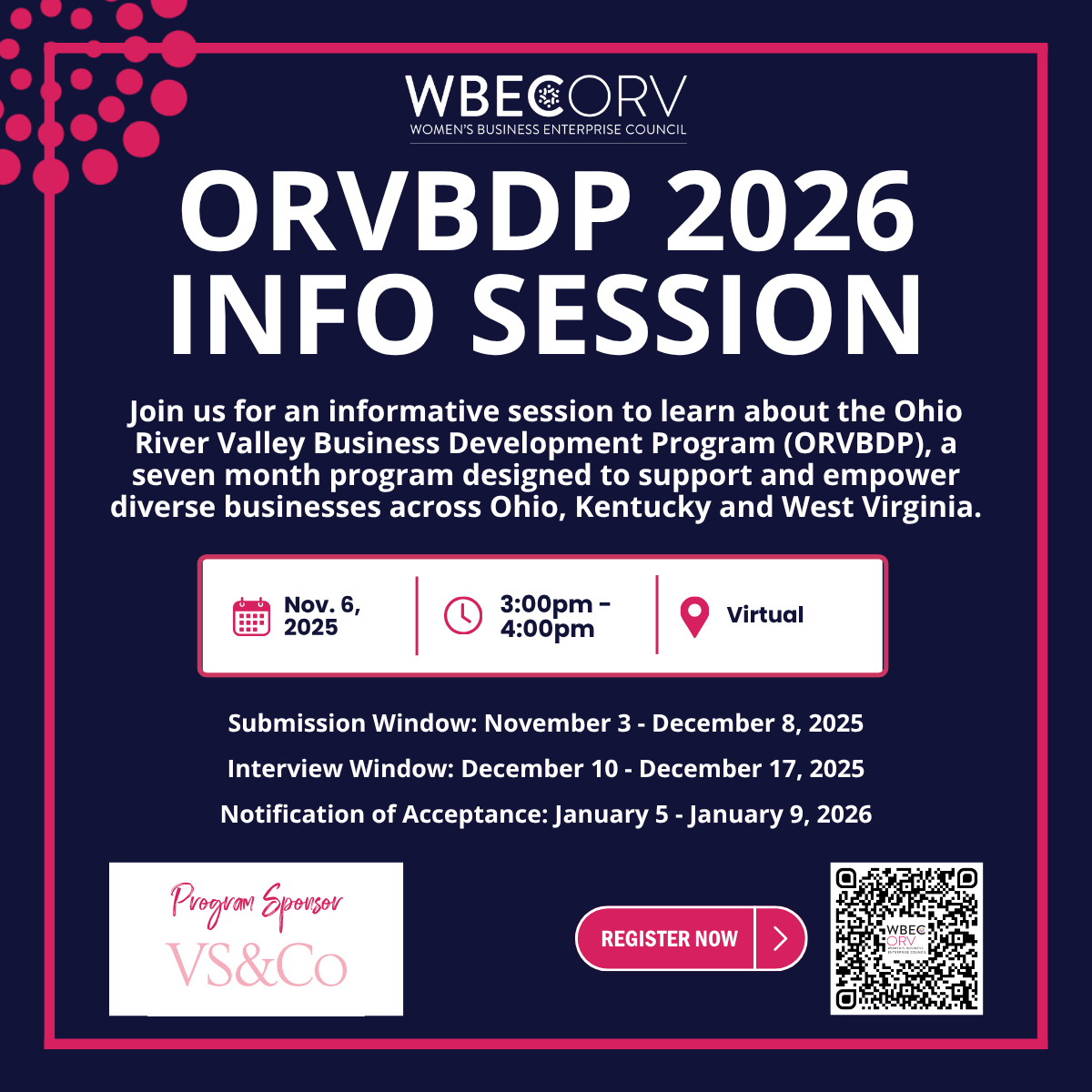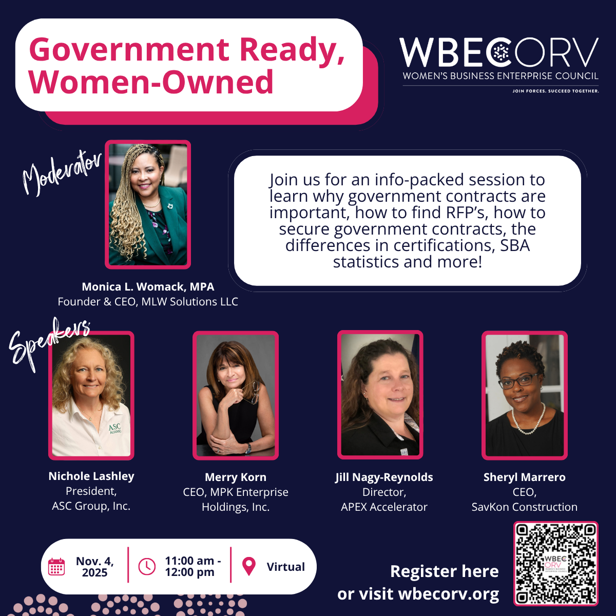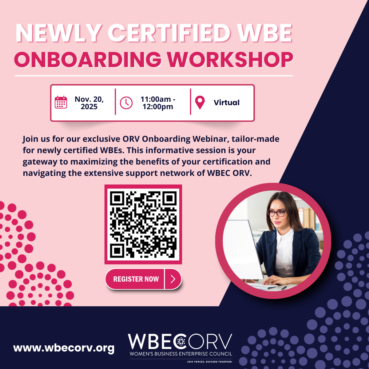 | | WBE Connect: West Virginia | Nov. 12, 2025 | 11:00am-12:00pm | Virtual | | Women of Color: Why Should I Get Certified? | |