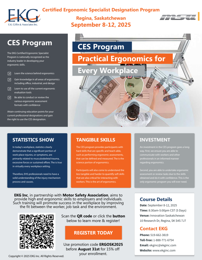 MSA members can access a limited-time discount from EKG Inc. for ergonomic skills training designed to improve the fit between the worker, job task, and environment. Covering both practical and science-based approaches for office, industrial, and design settings, this program runs September 8–12, 2025, in Regina.