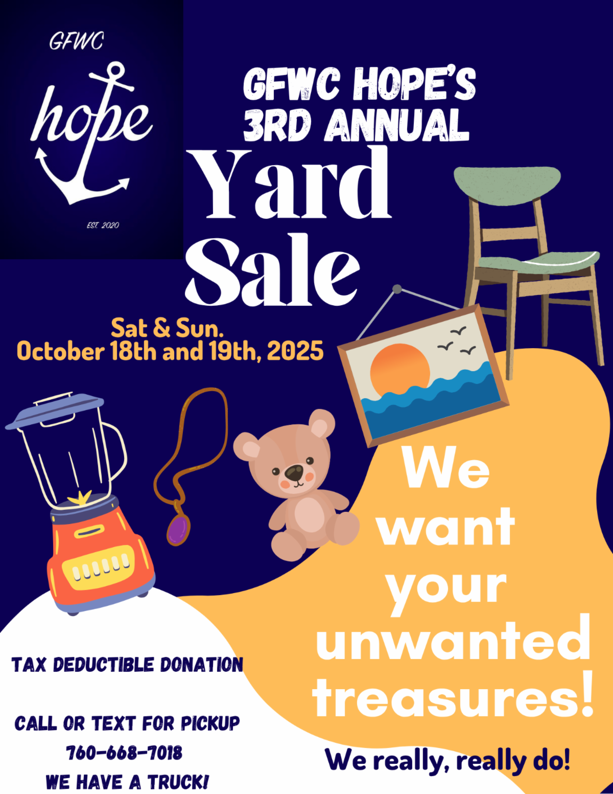 Secondly, our 3rd Annual HOPE Garage Sale is set for October 18–19. WCI has always been incredibly generous—and let’s face it, a good fall purge is great for mental clarity! Please consider donating to us again; we are accepting donations of all kinds—and yes, we'll pick them up! Tax donation receipts are happily provided upon request. So start cleaning those closets, and help us turn your cast-offs into community support!