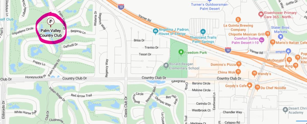 Our meetings will now be held at Palm Valley Country Club (Clubhouse), 39205 Palm Valley Drive, Palm Desert. It’s conveniently located just off Country Club Drive, west of Washington. (See map below.)