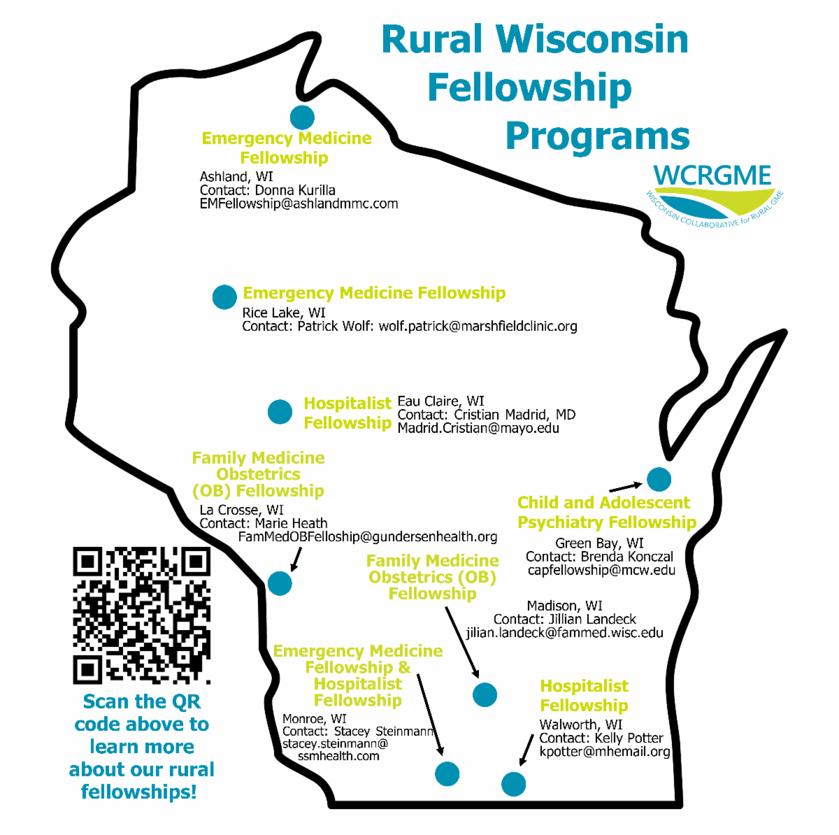 We are excited to announce that we have new fellowship programs to add to our Rural Wisconsin Fellowship Programs map! View our new interactive map on our website to learn more about our Rural Fellowships here: www.wcrgme.org/gme-directory | |