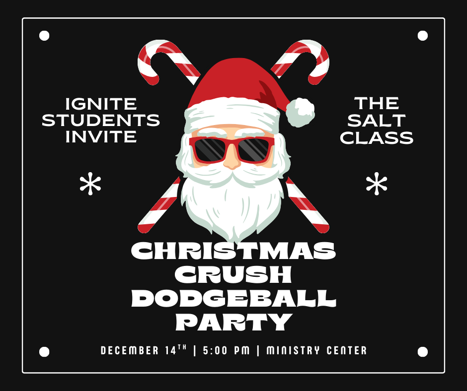 On Sunday, December 14, at 5 pm in the Ministry Center. join IGNITE Student Ministry for a Christmas Crush Dodgeball Tournament and plenty of other games.