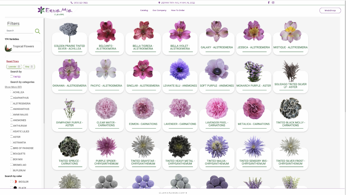 Also take advantage of the smart catalog we've built on our website, https://www.ecuamiaflowers.com/catalog in it you'll find the same selection as we have on our website, you can filter by flower, color, see our tropical selection and much more!