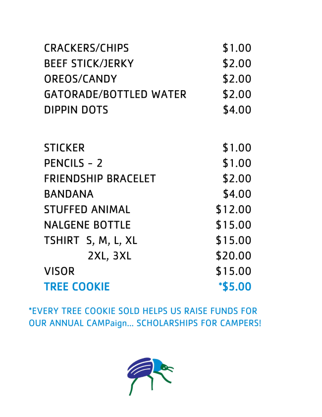 We recommend securing your camper's camp store money in an envelope or ziploc bag labeled with your camper's name. The camp store price list is below.