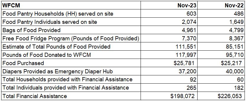As the calendar year comes to a close, we reflect on our blessings and look for ways that we can bless others in the community. Due to the generosity of many congregations, organizations, and individuals, WFCM staff and volunteers were able to provide more than 750 families with Thanksgiving groceries this year. And, with your continued support, we are prepared to provide December holiday/school's out groceries for hundreds of families again later this month.