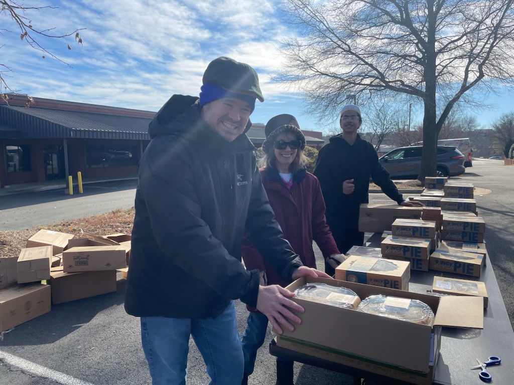 Prior to the Fairfax County Public Schools Winter Break, on Saturday December 20th (and the following Monday and Tuesday) we distributed holiday and school's out groceries including chicken or turkey, milk, eggs, cheese, pie, vegetables, fruit, canned vegetables, instant potatoes, canned fruit, chicken broth, rice, sugar, oil, baking mix, cereal, pasta, pasta sauce, tuna, and mac & cheese (valued at $82 for a family of 1-3 and $132 for a family of 4+) to 547 families including 422 WFCM client families and 125 social worker referred families from the 24 Fairfax County Public Schools in the Centreville, Chantilly, and Westfield school pyramids. This holiday food is entirely funded by the community and included the donation of 1,045 boxes of nonperishable food from local congregations and organizations, as well as donations of more than $14,500 for the fresh food, and 500 pies providing more than $65,000 of food for community members.