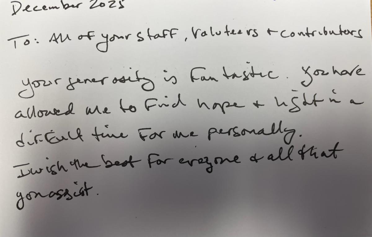 "To: All of your staff, volunteers, and contributors - Your generosity is fantastic. You have allowed me to find hope and light in a difficult time for me personally. I wish the best for everyone and all that you assist." CJ
