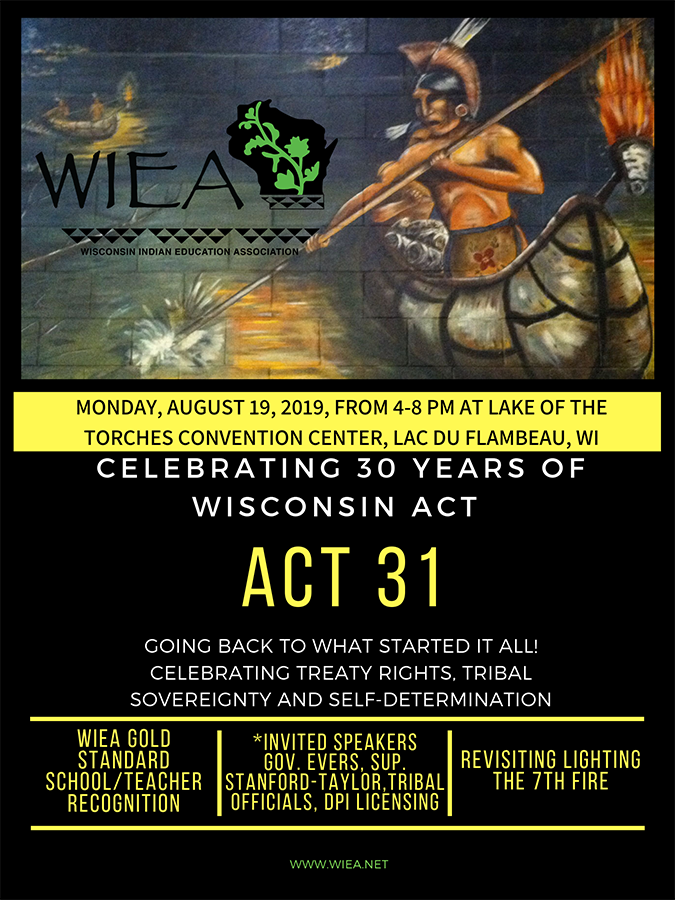 As we move into Summer mode, I'm hopeful you'll mark your calendars for another big WIEA event in August. On August 19, Lake of the Torches Resort Casino Convention Center in Lac du Flambeau will host our annual Act 31 Celebration. This year marks the 30th year of Act 31. As many of you know, Act 31 came to life out of treaty rights protests targeting Ojibwe spearers. Known to the other Ojibwe bands as "Waaswaaganing" or "The place where they spear fish by torch light", the Ojibwe people of Lac du Flambeau were heavily targeted by non-Indian protesters in the mid-to-late 1980s and early 1990s because of their proficiency as spearers. Many of these protests were ugly in nature. The use of racial epithets, slurs and even physical violence against the Ojibwe became common place. The protests weren't isolated to Lac du Flambeau - all the Ojibwe bands were targeted. A tense atmosphere prevailed across much of the northern half of the state and the racial discrimination spread to other tribal nations and their members in the state. It was a turbulent time in modern Wisconsin history. Thanks in part to the work of people like Alan Caldwell, Tom Maulson and many others, Act 31 became law in 1989. While we have a long way to go, the groundwork was laid for public schools to incorporate more accurate curriculum of the history of Wisconsin's original inhabitants. Ongoing work by the State/Tribal Relations Committee and WIEA to strengthen Act 31 has proposed changes one step closer to becoming law. These changes will beef up the language contained within the Act and help the general public better understand not only Native Americans, but other minority groups as well. Invited speakers for the Act 31 Celebration include Tribal leaders, Gov. Tony Evers, Sup. of Public Instruction Carolyn Stanford-Taylor, Senator Lena Taylor and may others. The celebration begins at 4 pm and is expected to run until 8 pm. We'll have a number of presentations, a viewing of the PBS documentary "Lighting the Seventh Fire", a feast and more. As we confirm our speakers and schedule of events, more information will be forthcoming. I look forward to seeing everyone there!