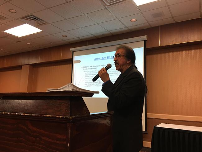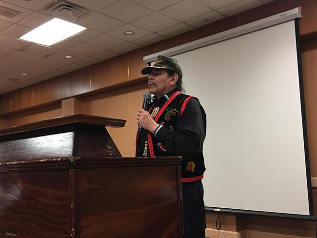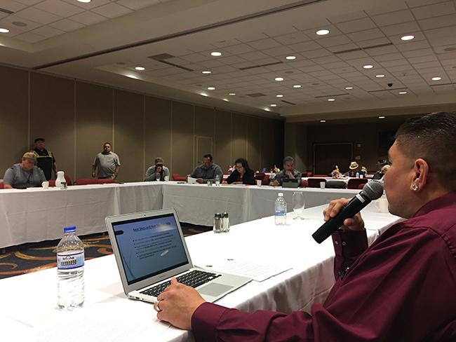 Board President Brian Jackson presents the proposed Act 31 changes to tribal leaders at the May 16 Chippewa Federation meeting in Danbury, WI.