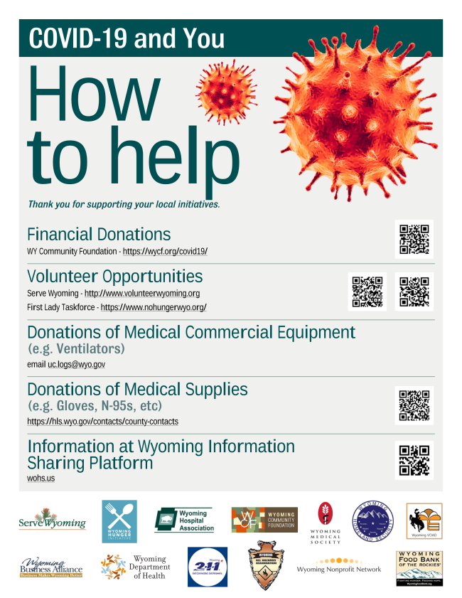 If you are interested in learning about how you can help with COVID-19 relief efforts in Wyoming, please click on the flyer. There are a number of ways to get involved and help around the state.