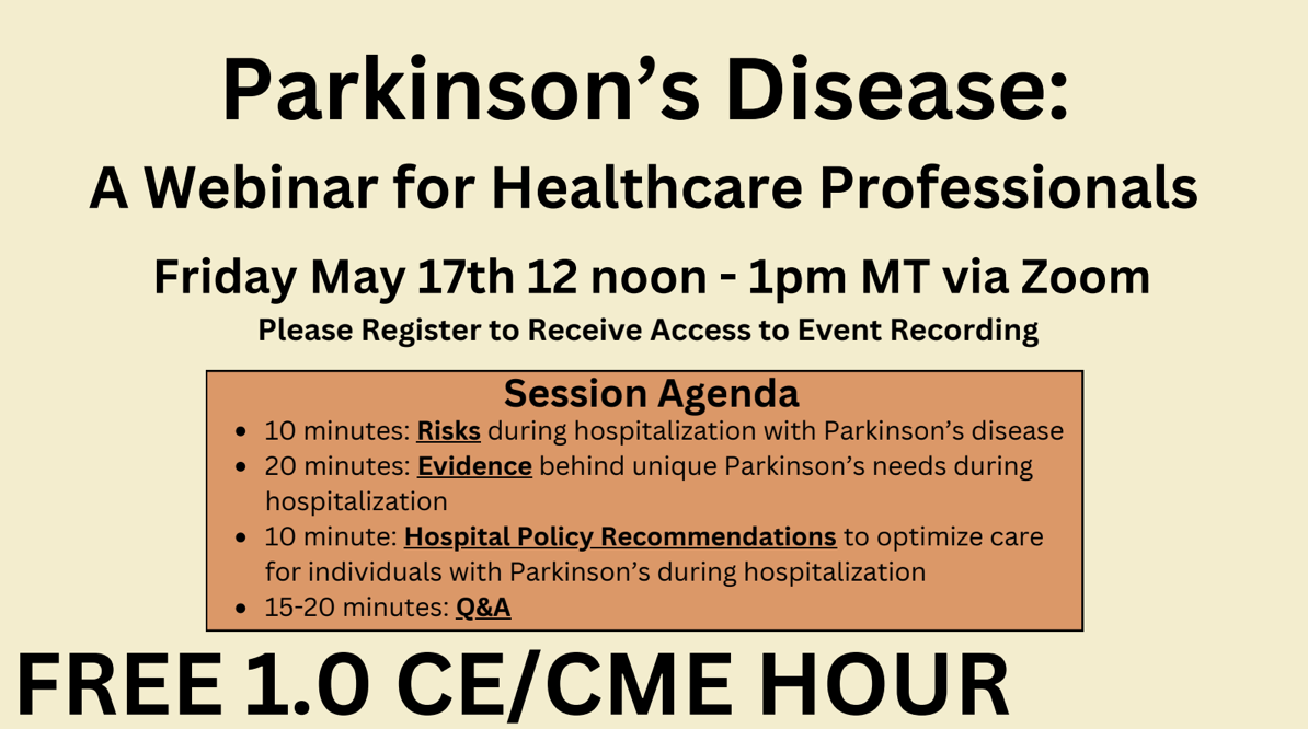 May 17th, 2024 at 12:00PM (Mountain): “Parkinson’s Disease: Interdisciplinary Excellence in Hospital Care.”