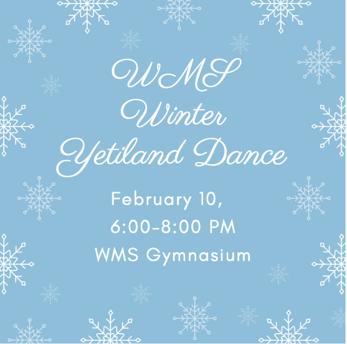 Exciting news.......WMS will be having a winter yetiland dance on Friday, February 10 from 6:00 to 8:00 in the gym. The dance is free, but students will need a ticket via the link below. https://www.eventbrite.com/e/wms-winter-yetiland-tickets-520685423117 | | | |