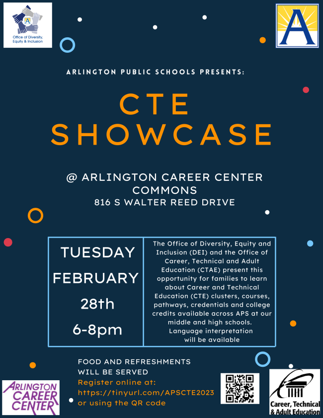 After opening remarks, the event will be open-house style, where families can learn about the CTE programs across APS. Teachers will have booths set up with information & demonstrations/coursework samples. We will have interpreters available for families. Food will be provided for attendees. Families can register here