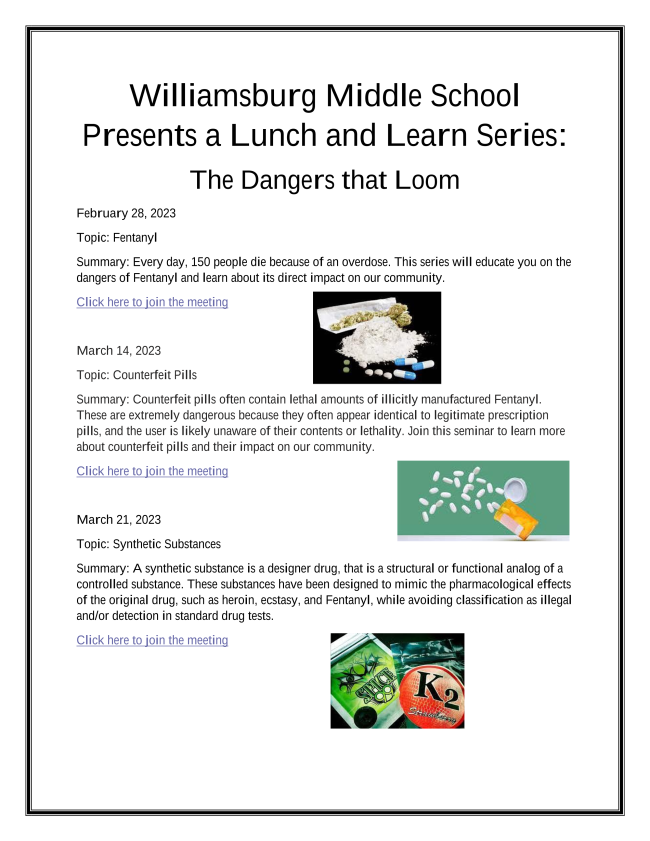 We will have a lunch and learn series with our Substance Abuse Counselor, Ms. Sexton.