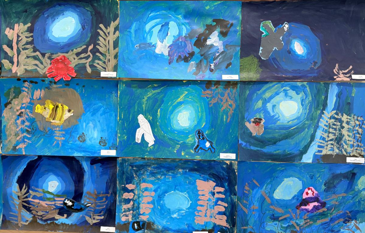As their studies continued, students researched sea creatures, uncovering fascinating facts about their habitats, diets, and adaptations to life at different depths. They also created paintings of the kelp forest, which are now on display in the lobby (with a few featured below).
