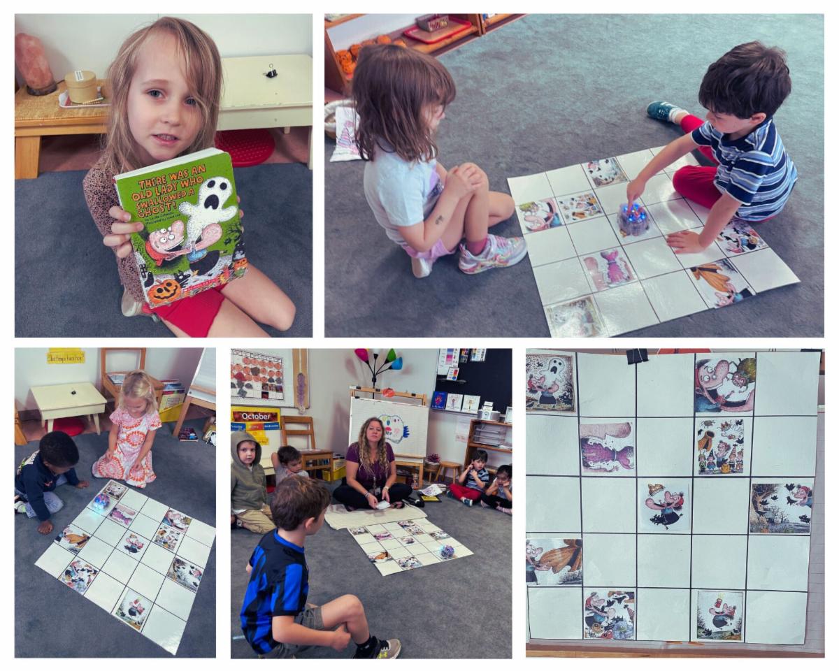 Primary students in Room 19 are exploring literacy and coding skills through memorable stories and hands-on activities, most recently using There Was an Old Lady Who Swallowed a Ghost by Lucille Colandro. The class enjoys different versions of this story throughout the school year. Children love these tales because they are silly, they rhyme, and they can almost always turn the pages into a tune based on the original song, "There Was an Old Lady Who Swallowed a Fly." These stories also serve as a memorable way to practice reading comprehension. After reading, students retell the story by sequencing it from memory, a skill that enhances communication, mathematical thinking, problem-solving and organization.