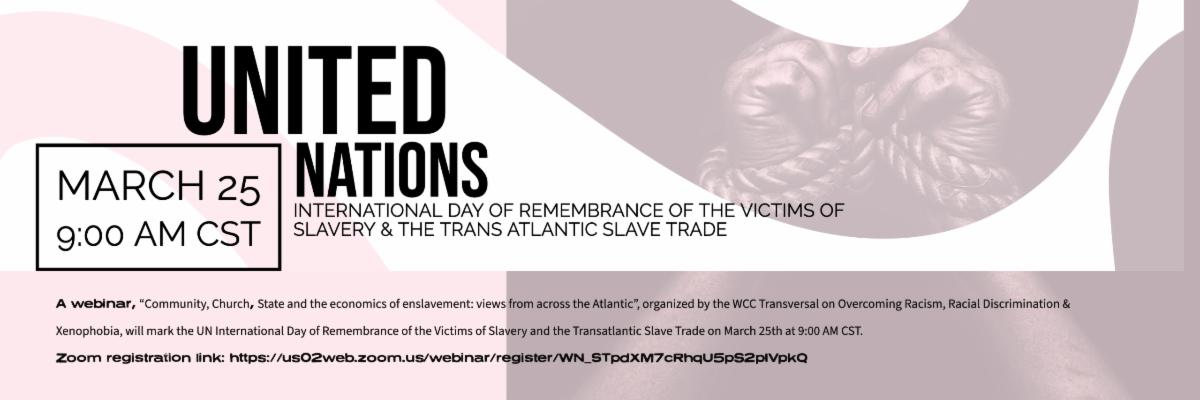 A webinar, “Community, Church, State and the economics of enslavement: views from across the Atlantic, ” organized by the WCC Transversal on Overcoming Racism, Racial Discrimination & Xenophobia, will mark the UN International Day of Remembrance of the Victims of Slavery and the Transatlantic Slave Trade, tomorrow, Friday, March 25, 2022 at 9:00 AM CST.