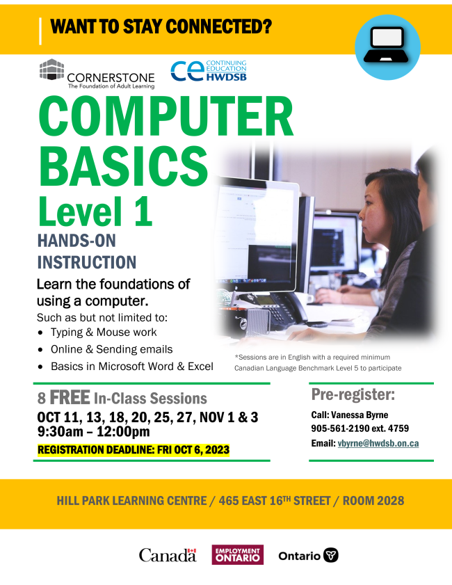 Hill Park Learning Centre is accepting registration for the Computer Basics Level 1 Course. Limited spots are available. Please see the attached flyer for specifics.