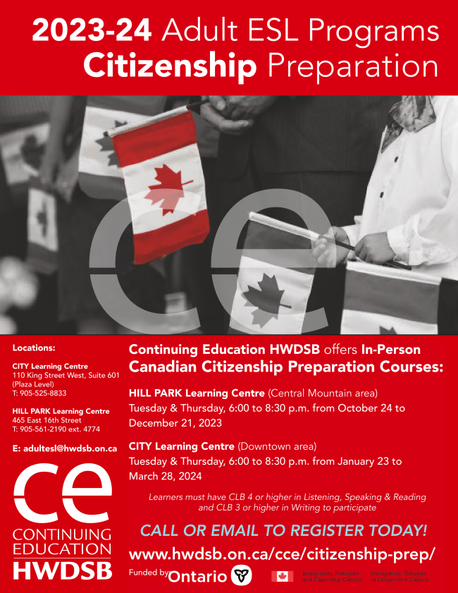 HWDSB is offering Citizenship Preparation classes on Tuesday and Thursday nights from 6:00 to 8:30 at Hill Park Learning Centre (Central Mountain).