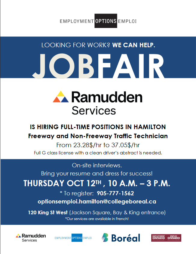 Employment Options/Collège Boréal will be hosting a job fair with Ramudden Services on October 12th from 10 a.m.-3 p.m.