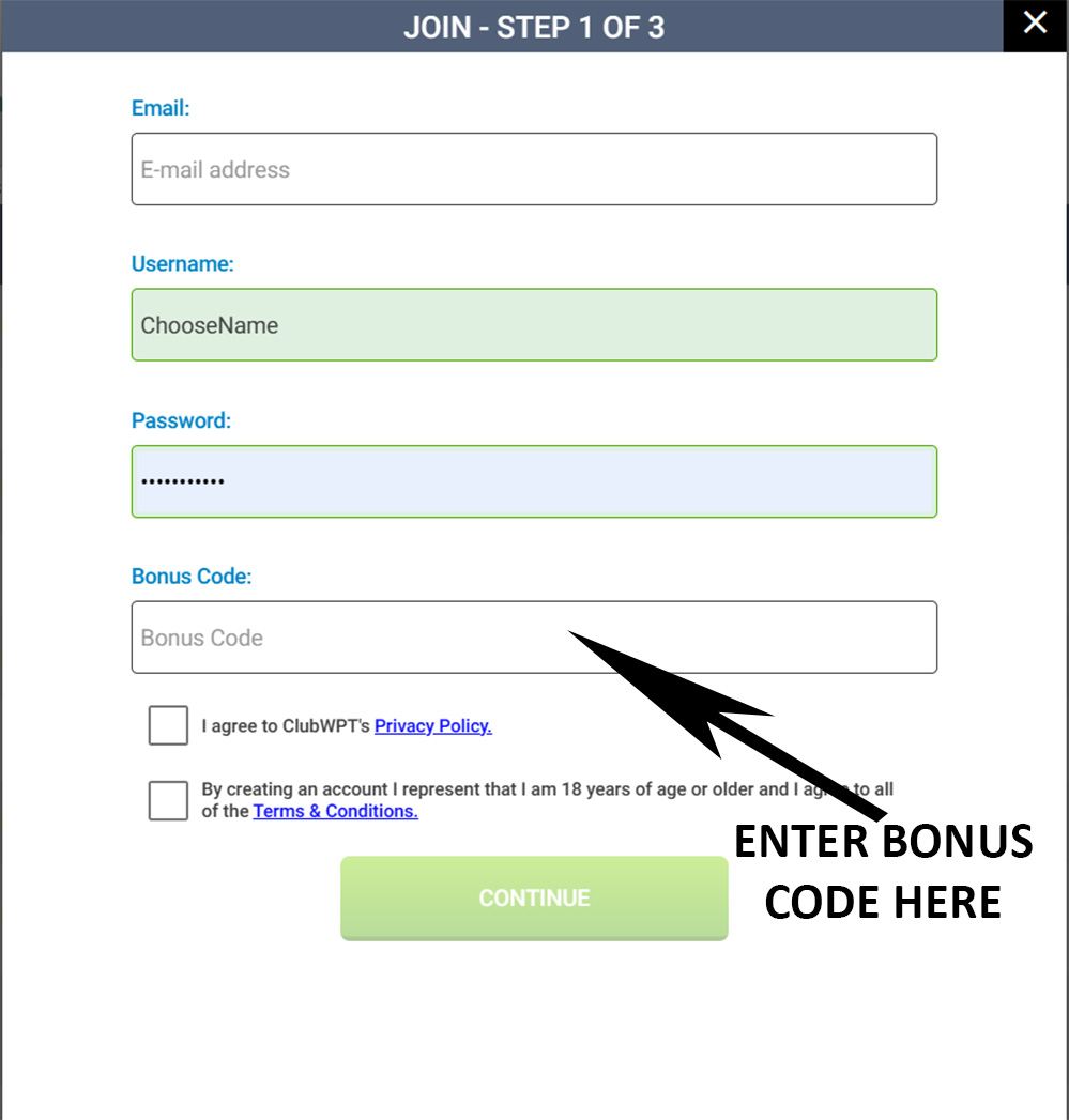You will need to JOIN ClubWPT as a "VIP" Member, and since you have earned your invitation thru WPT League Events you have earned a complimentary trial membership. By using the BONUS CODE shown below during your registration you will not be charged for your membership (as long as you cancel before the trial period ends).