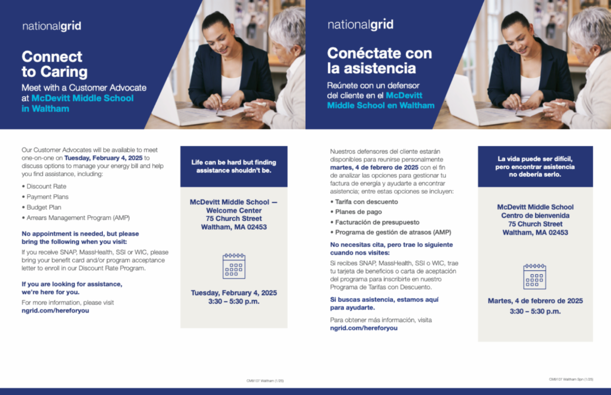Are you a National Grid customer? Customer Advocates from National Grid will be available on Tuesday, February 4th, from 3:30-5:30pm at McDevitt Middle School, to meet one-on-one with Waltham community members in English and Spanish. During their visit, you will be able to discuss and manage your energy bill and also find assistance with discounted rates, payment plans, budget plans, and the Arrears Management Program (AMP). Please refer to the flyer for documents that you should bring. No appointment is required. |