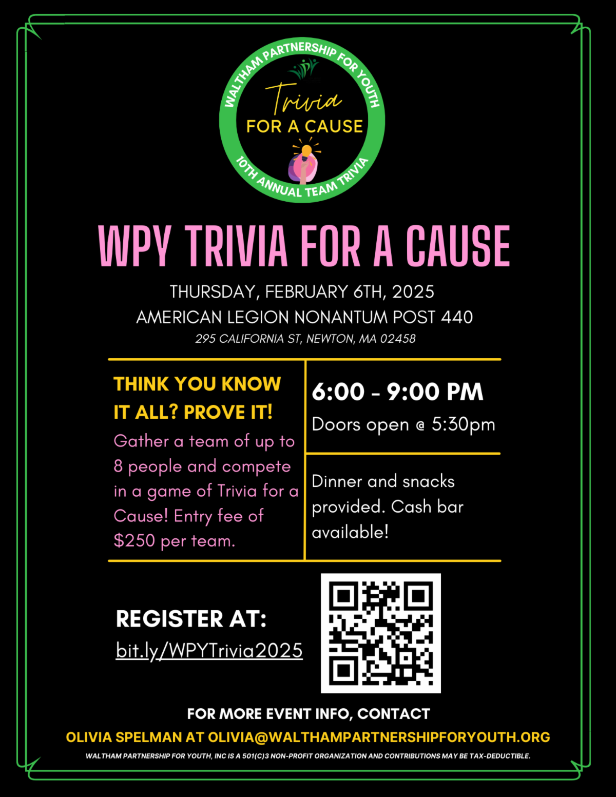There is still time to join us on February 6th from 6-9pm for WPY's Trivia for a Cause! Enjoy an exciting night out with your friends and colleagues, while supporting life-changing youth programming in Waltham.