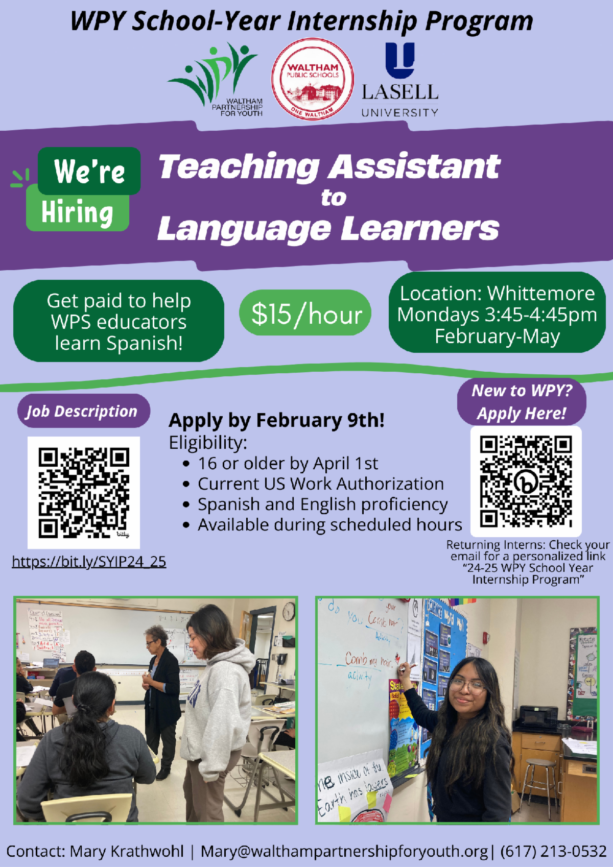 As Teaching Assistants to Language Learners, WPY interns work alongside Lasell University student-teachers, who are teaching Waltham Public Schools staff Spanish. Interns assist with session planning and serve as conversation partners to help the educators improve their Spanish skills. We're looking for bilingual heritage Spanish speakers to support this initiative and empower our local educators.