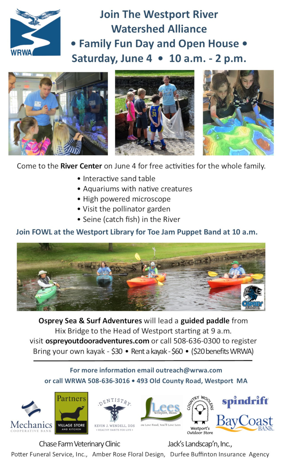 Proceeds from these events and activities benefit WRWA’s science and education programs. WRWA’s mission: Working together to protect and preserve the Westport River watershed now and for future generations.