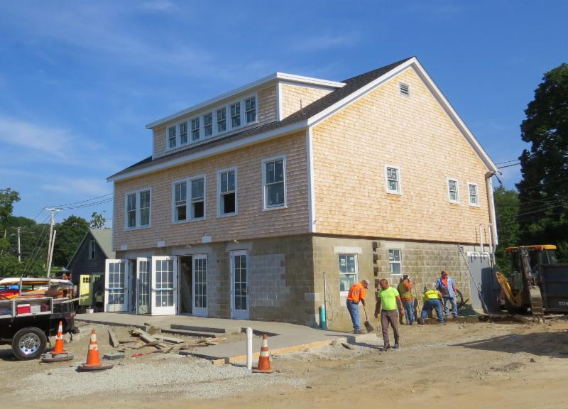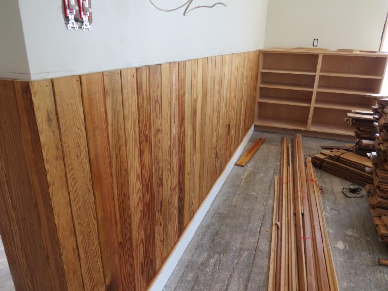 Work is moving along on the new River Center. The utilities are connected, and finish work is ongoing inside the building. The lumber that was saved from the third floor has been planed and now makes up the wainscoting and work stations on the second floor. The old sliding door has been re-purposed in the second floor hallway.