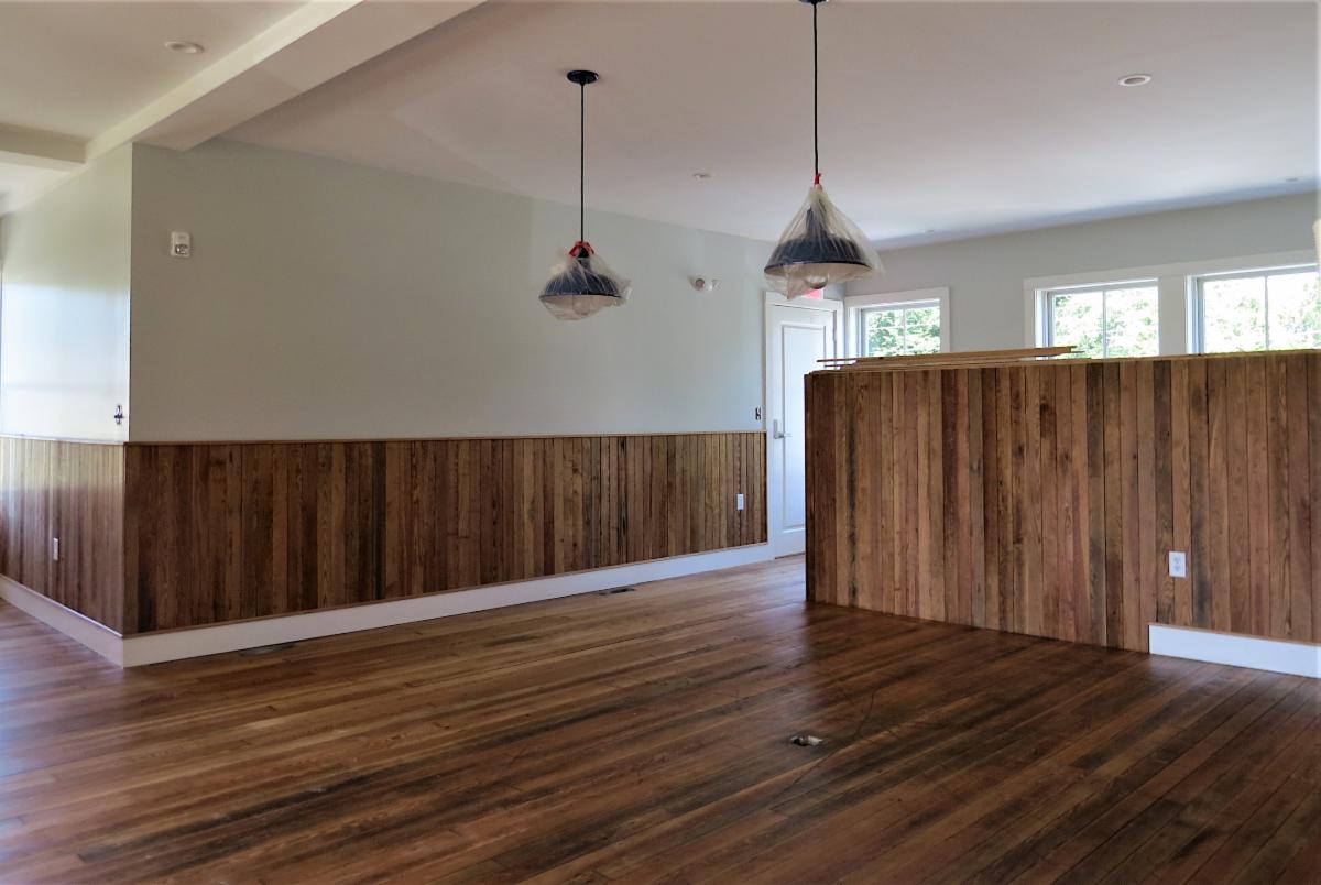 Here are some of the highlights: The building is very energy efficient, with high R value insulation, and has LED lighting throughout. There will be solar panels on the roof, which will provide over 90% of our electrical needs. Composting toilets are installed to minimize impact on River water quality. We have reused much of the wood salvaged from the old attic.