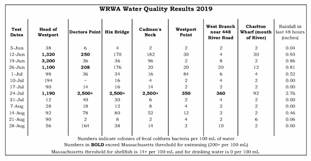 The Westport River Watershed Alliance has been sampling water quality at 19 sites along the Westport River since the 1990’s. This program monitors the river every week from the beginning of June to the end of August. Bacteria levels can change by the day, each week’s results refer only to the morning on which the samples were taken. This summer we saw elevated levels of fecal coliform, especially during wet weather events. Bacteria levels are typically elevated during wet weather events, a good precaution to take includes avoiding swimming right after a heavy rain. During dry weather, bacteria levels are typically low and the entire River is usually considered safe for swimming.