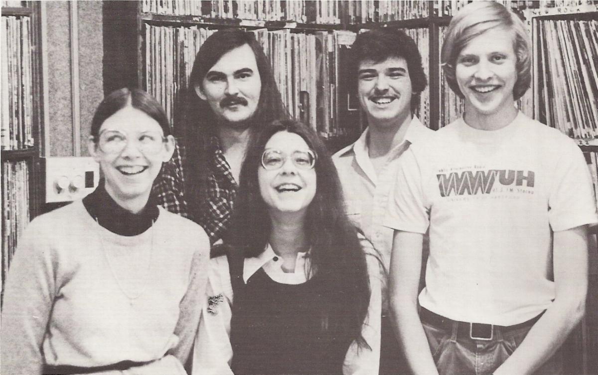 (Image below, station management team, early 80s, L-R: Patty Kurlychek, John Ramsey, Carol Brosseau, Andy Winters, Doug Maine)