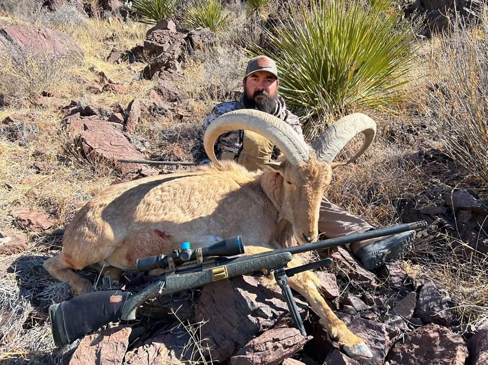These hunts take place in the mountains of West Texas, on approx. 80,000 acres, with a year-round population of aoudad. Although you can cover a lot of ground on 4 wheelers, this hunt can be physically demanding and it will be to your advantage to be in good physical shape, although they can accommodate most hunters. You hunt elevations of 4,500-6,500 feet on some rugged rocky terrain in a typical desert habitat; rocky slopes and good balance and quality boots and footwork do help. Temperatures range from 20 degrees to 85 degrees. Shots will average between 150 to 350 yards, although terrain can cause some shots to be 400+ yards.