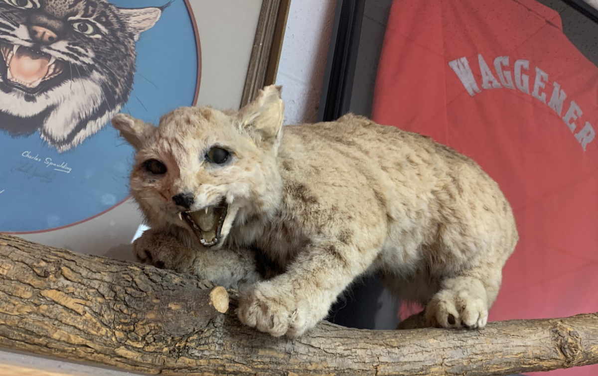 Making a surprise appearance recently is the (taxidermied?) wildcat some of you may remember from the trophy cases. Rescued from oblivion by Jennifer Hall ('72). Now safely stored atop the the trophy cases in the Alumni Room.