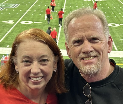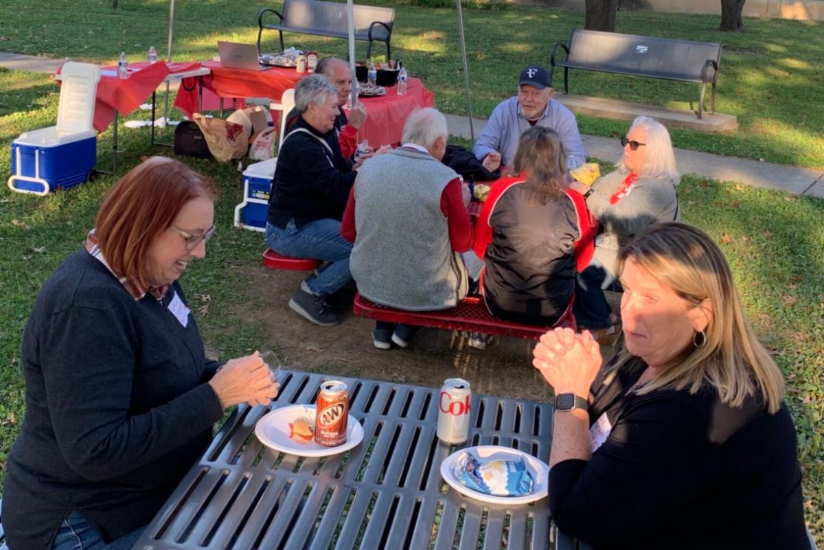 Around 25 Alumni enjoyed a tailgate meal in the courtyard before the 2024 Homecoming Game. Pictured are Sally Campbell (Toutant) '79, Lucie Mohr (Toutant) '77, Lyn Lage (Briggs) '76, Scott Terry '76, Russell Forseth '72, Nina Yussman '75, Terry Dillard '73, Mike Mansfield '72.