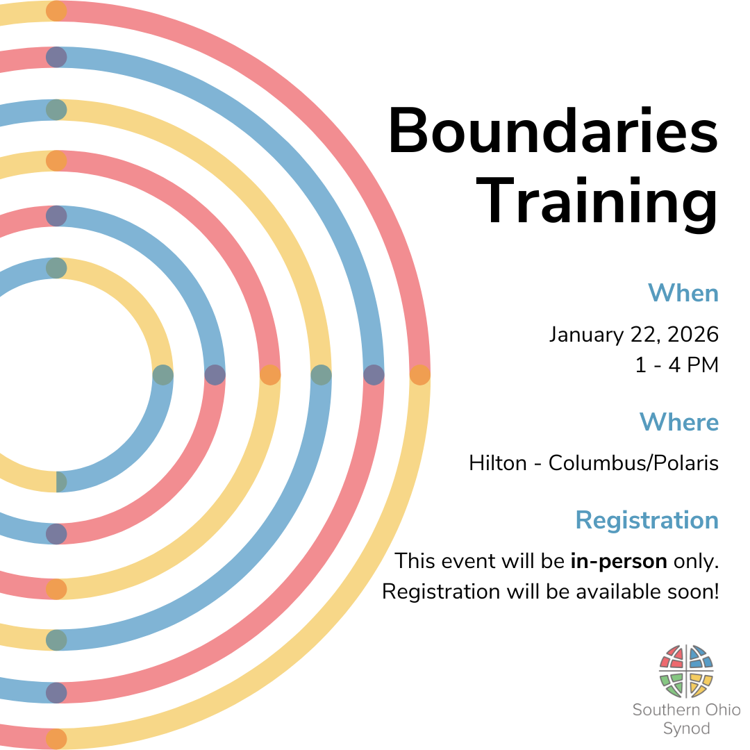 The Southern Ohio Synod will hold Boundaries Training for Rostered Ministers on Thursday, January 22, 2026 from 1 - 4 PM at the Hilton - Columbus/Polaris.