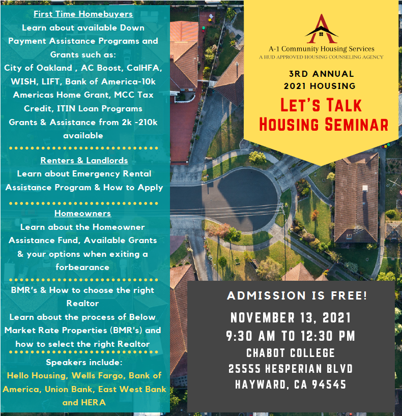A-1 Community Housing is hosting the 3rd annual "Let's Talk Housing Seminar" on Saturday, November 13th from 9:30 AM - 12:30 PM at Chabot College.