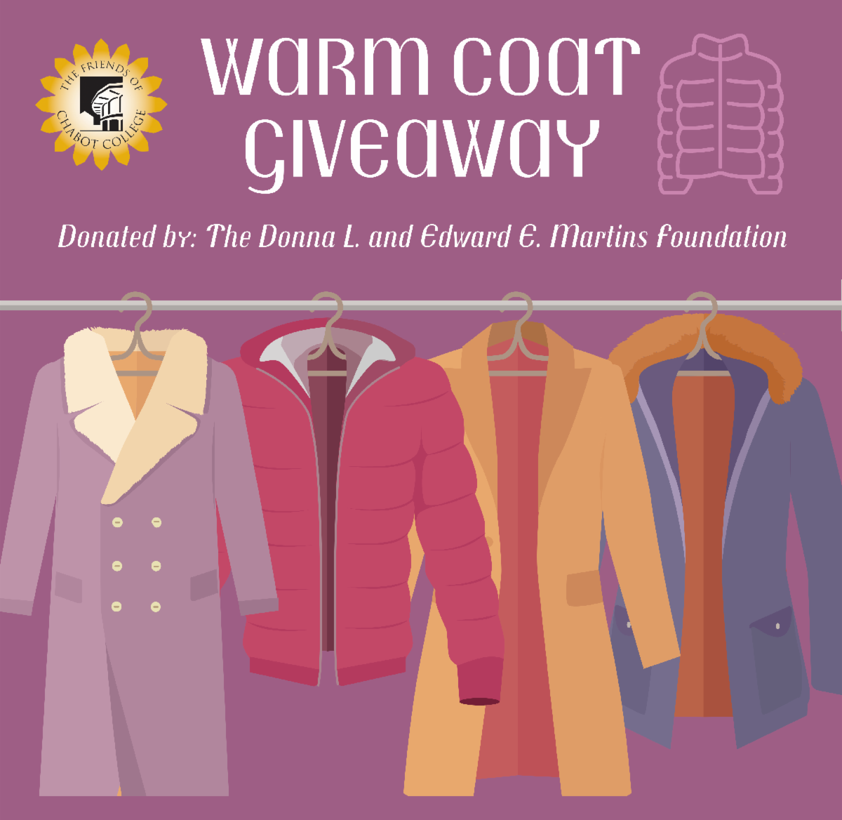 On Saturday, November 13th from 10:00 A.M. - 2:00 P.M., the Donna L. and Edward E. Martins Foundation will be hosting a Warm Coat Giveaway FREE for Chabot College students.