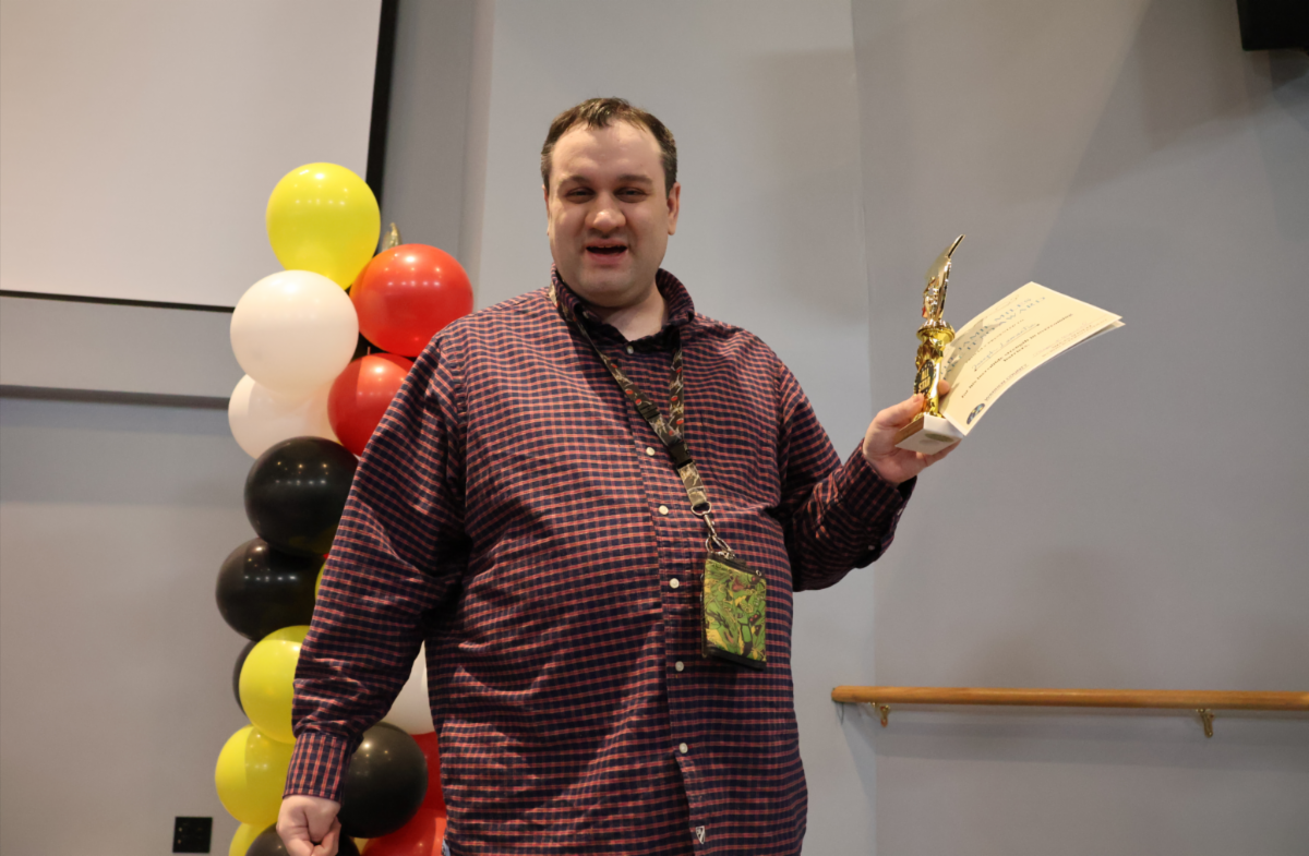 | The Team Player Award honors a candidate who contributes positively to a group by demonstrating strengths in teamwork, collaboration, and support. Advocacy Coordinator Ellen Hudson presented the award to Luke Marshall for his work as president of the Voices Speaking Out (VSO) Self-Advocacy Group and Special Olympics. | | |