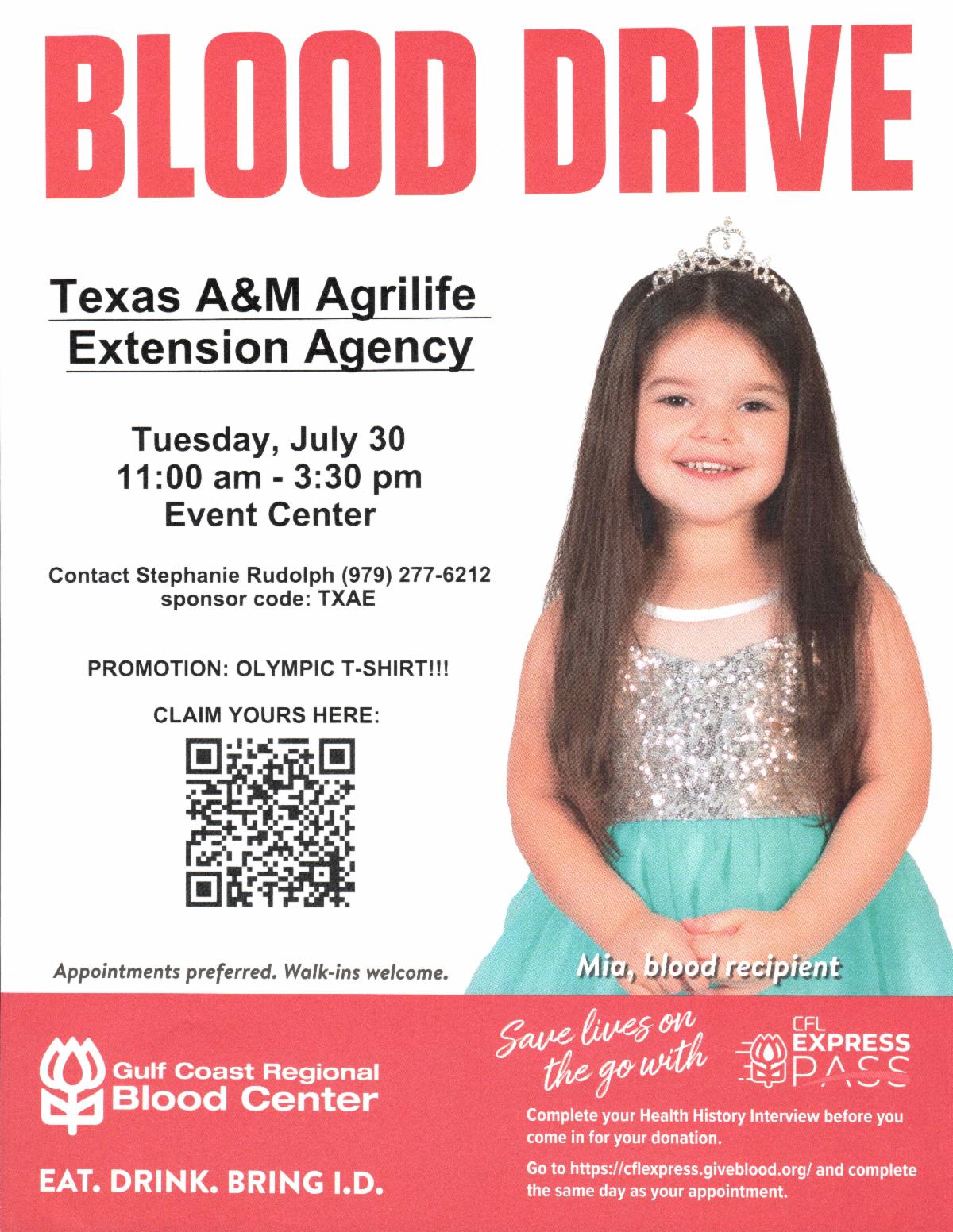 The Washington County Extension Office is working with the Gulf Coast Regional Blood Center to host a Blood Drive on Tuesday, July 30, 2024, at the Washington County Expo. Everyone who donates will receive a FREE Olympics T-shirt! Donors must be 16 years old or older. Appointments are preferred, so set your donation time now! Walk-ins are welcome if you are still determining your schedule for that day.