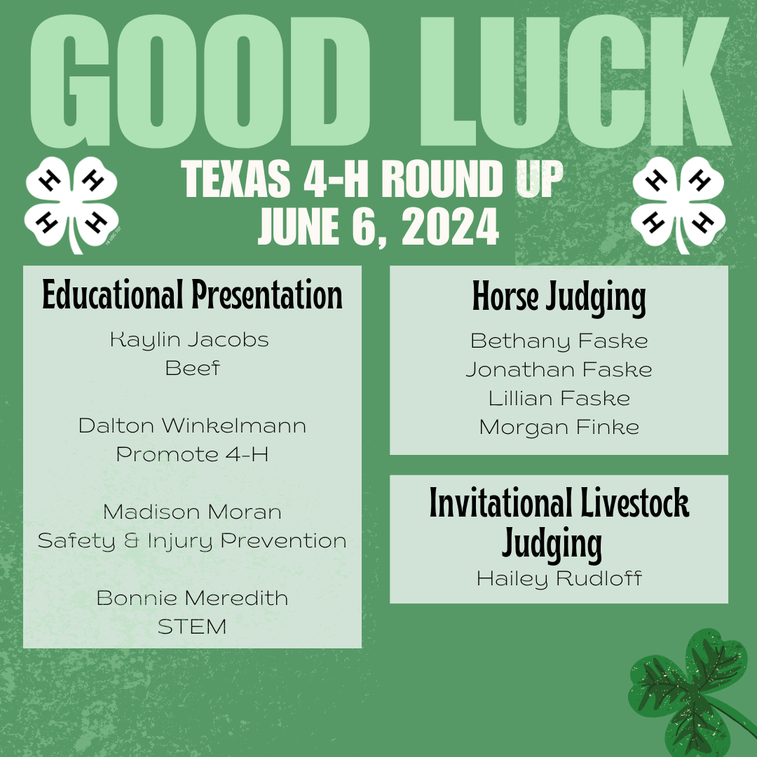Texas 4-H Roundup is the pinnacle event of the state 4-H program. The event consists of approximately 50 competitive events, with some of these contests requiring each individual or team to qualify at the county and district level to compete. Senior level (9th-12th grade) 4-H members participate at this event, which also holds scholarship recognition, retiring of the State 4-H Council, educational workshops, a trade show, and high energy assemblies.
